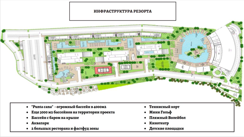 При въезде в резорт расположены 25 этажный 5 звездочный отель и казино, рядом с ним огромный бассейн на 4000 м2, с ресторанами и зонами отдыха . Сдача в эксплуатацию 2022 год.