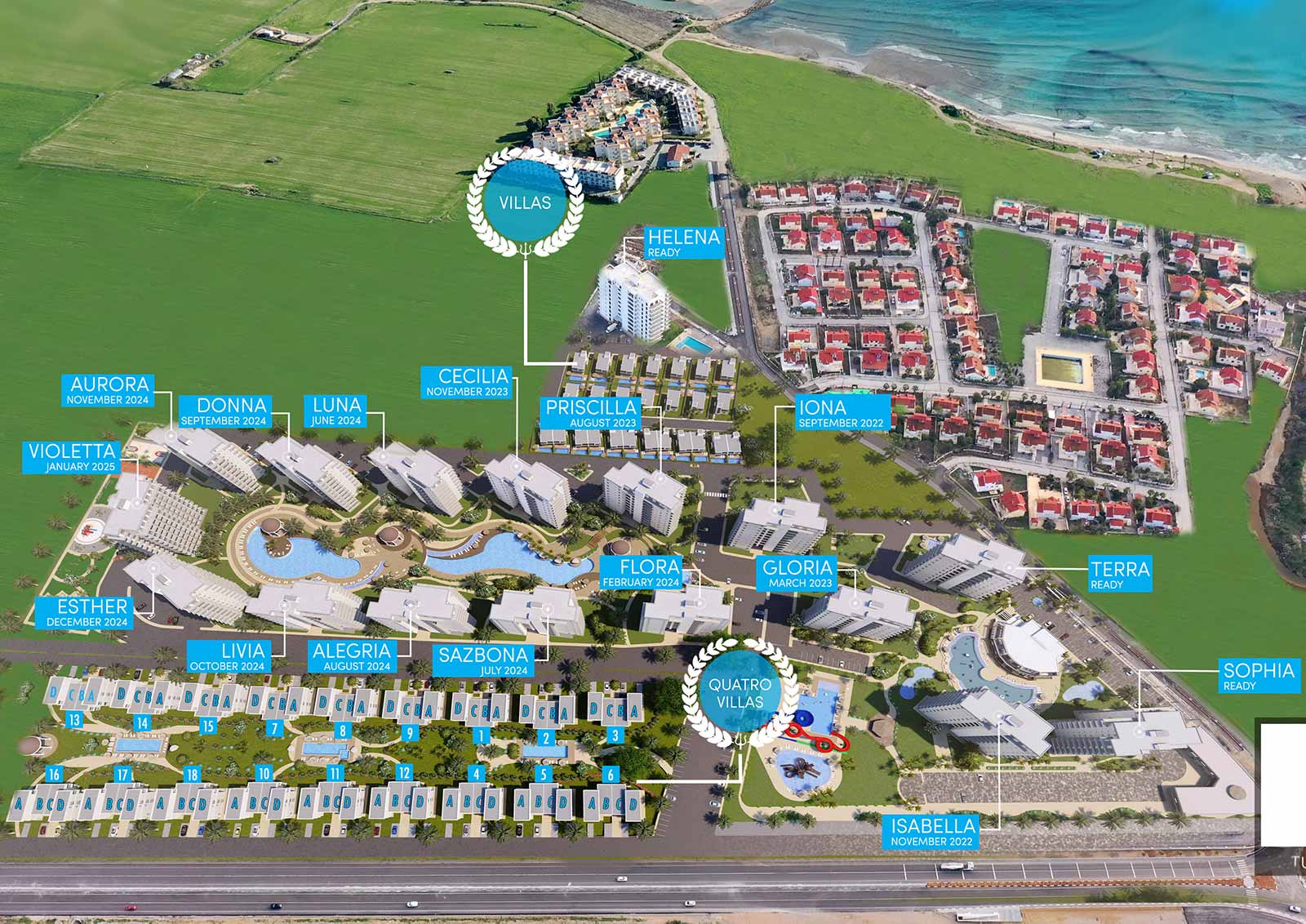 Комплекс состоит из семнадцати блоков, отдельных вилл и шестнадцати блоков кватро вилл.